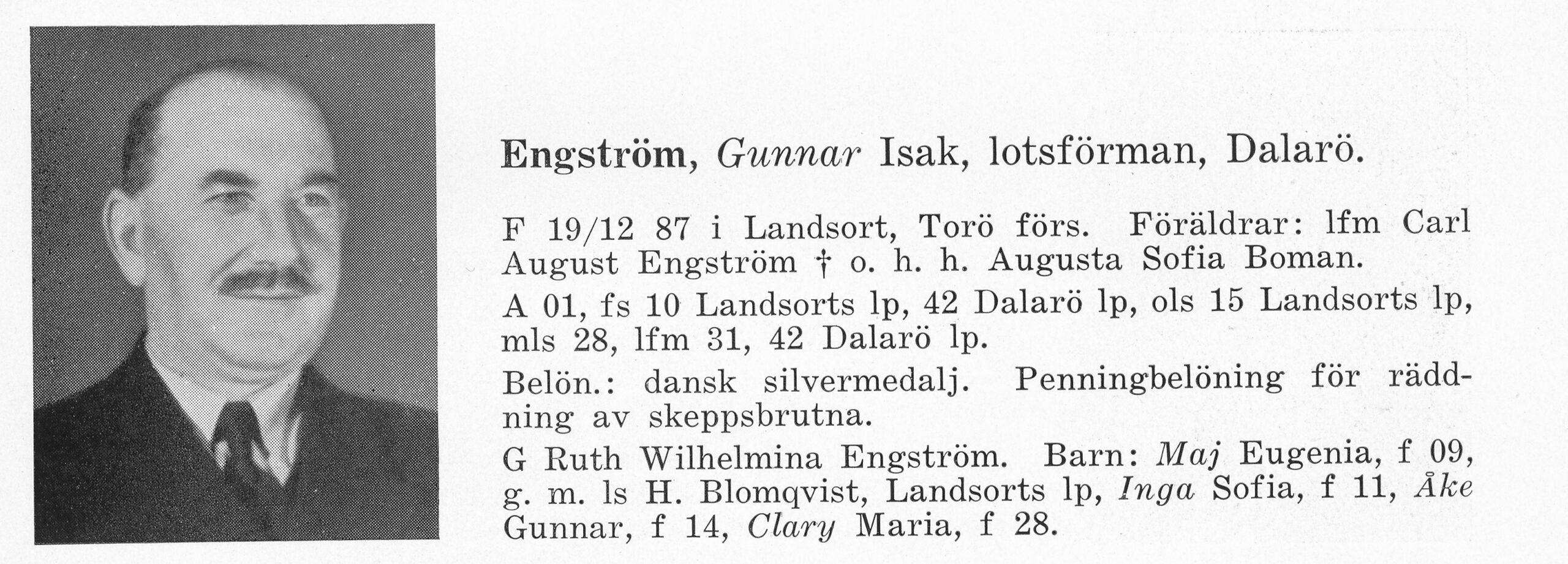 Carl Gustaf Engel, f. 25/9 1842 (lotsson), lotslärling 1/7 1854, styrsedel 23/6 1859, sek.-lots 4/8 1862, mästerlots 13/3 1865. Bosatt i Dalarö.